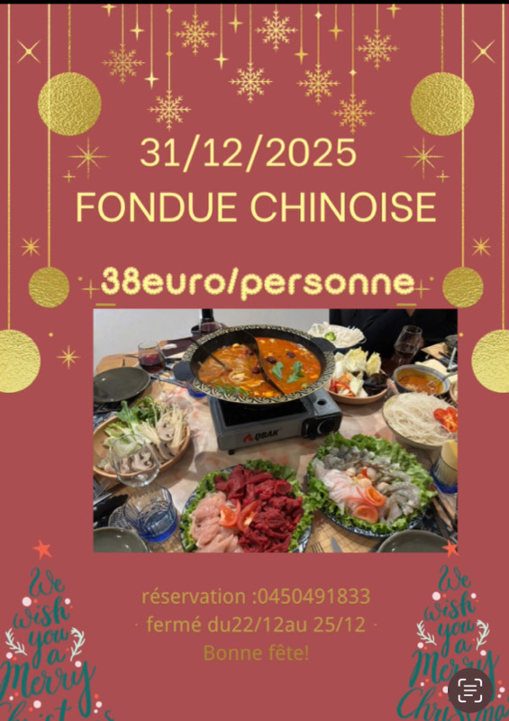 Notre restaurant sera fermé du 22 au 25 décembre, et rouvrira normalement le 26. Nous serons également ouverts le 1er janvier 2026. Le soir du 31 décembre, nous organisons un dîner de fondue chinoise à 38euros par personne. Pour réserver, veuillez nous contacter au 0450491833